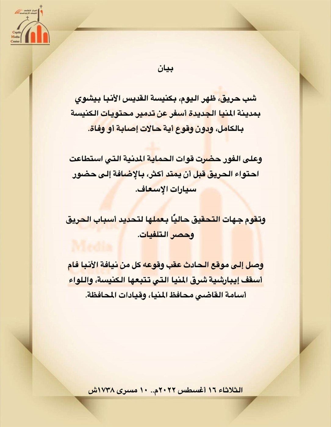 أصدرت الكنيسة القبطية الأرثوذكسية، بيانًا حول ملابسات حريق كنيسة الأنبا بيشوي بمدنية المنيا الجديدة.