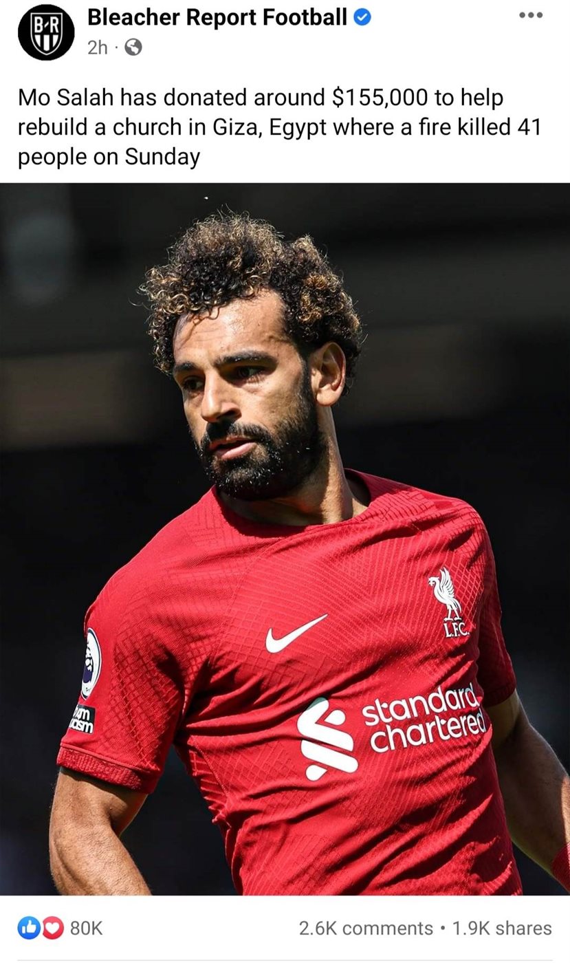 كشفت الصحف العالمية عن العمل الخيري، الذي قام به الدولي المصري محمد صلاح، نجم فريق ليفربول الإنجليزي، حيث تبرع بمبلغ يصل حوالي 155 ألف دولار للمساعدة في إعادة بناء كنيسة أبوسيفين في الجيزة ، حيث أدى حريق إلى مقتل 41 شخصًا يوم الأحد.