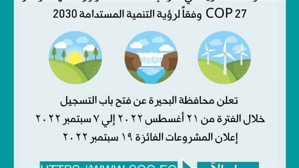 أعلنت محافظة البحيرة عن بدء تنفيذ المبادرة الوطنية للمشروعات الخضراء والذكية داخل المحافظة والمنفذة على مستوى الجمهورية تحت رعاية الرئيس عبد الفتاح السيسي، على أن يتم استمرار تقديم المشروعات على الرابط “http://www.sgg.eg” وحتى ٧ سبتمبر ٢٠٢٢ لكافة القطاعات والأفراد والجهات.