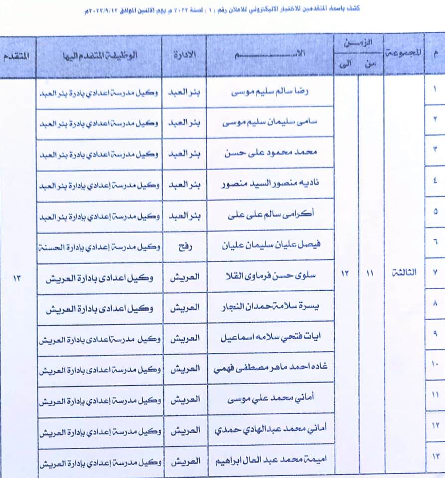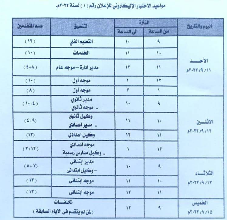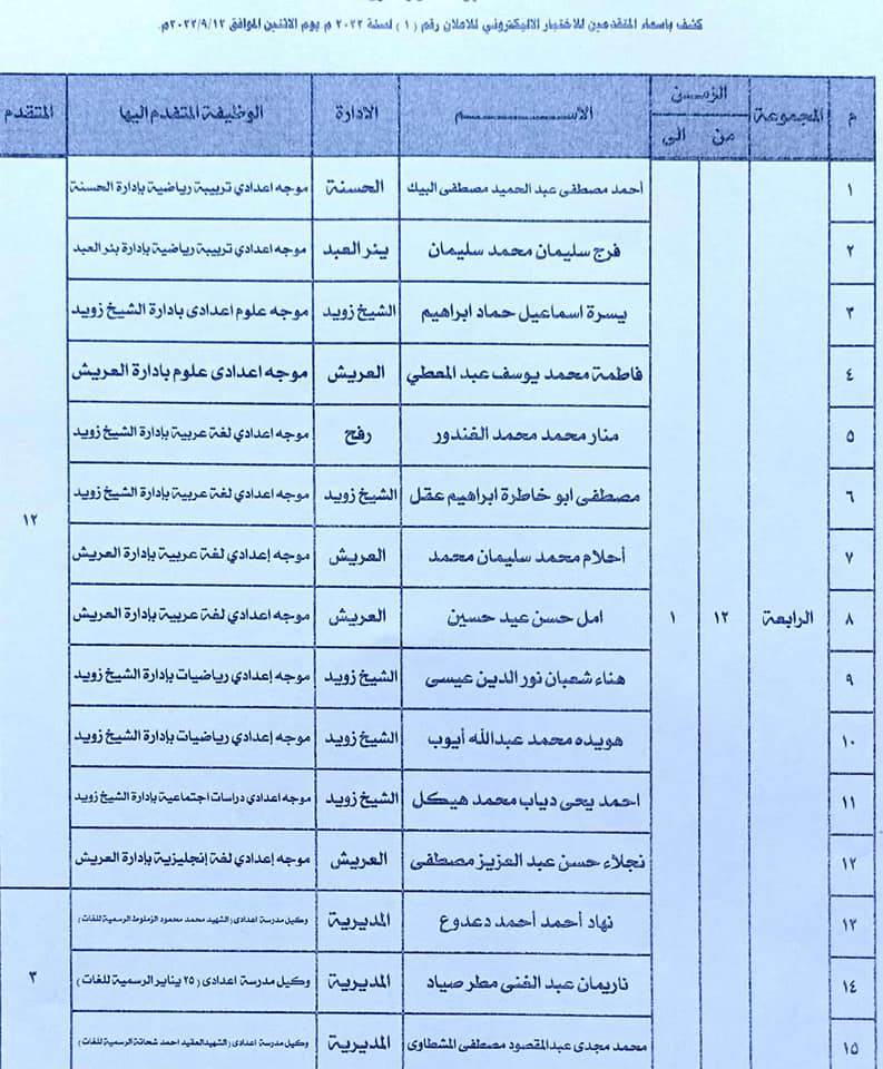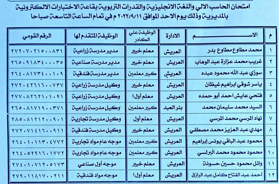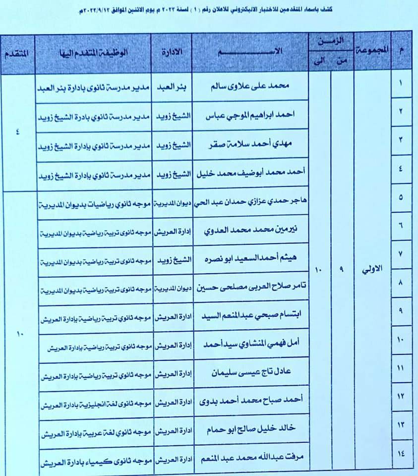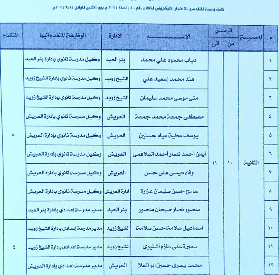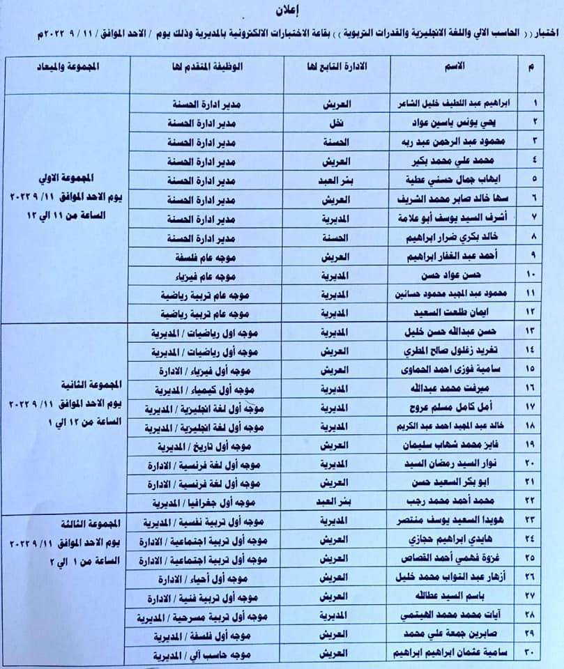 ويوم الاثنين 12 سبتمبر الجارى للمتقدمين لوظيفة : مدير مدرسة ثانوى ببئر العبد والشيخ زويد ( 4 ) وموجه ثانوى لمختلف المواد الدراسية وعددهم ( 10 ) أفراد .. الى جانب المتقدمين لوظائف : وكيل ثانوى ( 8 ) ومدير اعدادى ( 4 ) ، وكيل اعدادى ( 13 ) وموجه اعدادى في مختلف المواد الدراسية وعددهم ( 12 ) فردا ، ووكيل مدرسة رسمية للغات وعددهم ( 3 ) أفراد .