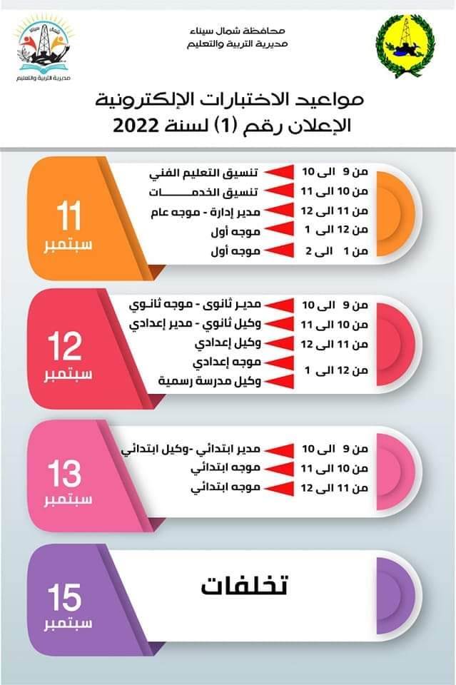 أعلنت مديرية التربية والتعليم بشمال سيناء عن مواعيد الاختبارات الإلكترونية للمتقدمين لوظائف الترقى في تنسيقات (الوظائف الإشرافية - التعليم الإعدادى والثانوى - التعليم الفنى - الخدمات والأنشطة) طبقا للإعلان رقم ١ لسنة ٢٠٢٢ وفقا للقانون ١٥٥ لسنه ٢٠٠٧ وتعديلاته.