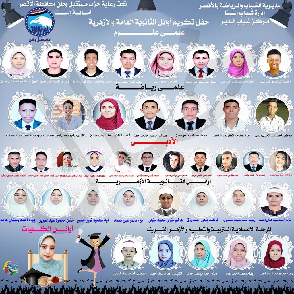 وفي محافظة الأقصر، نظم حزب مستقبل وطن بالمحافظة، احتفالية كبرى لتكريم المتفوقين من طلبة الثانوية العامة والأزهرية، وطلبة المرحلة الإعدادية بالتربية والتعليم والأزهر الشريف المتفوقين، وطلبة الكليات المتفوقين، على مستوى مركز إسنا بالتعاون مع مركز شباب قرية الدير، وحضر الاحتفالية النائب الدكتور محمد العماري أمين حزب مستقبل وطن بمحافظة الأقصر، والنائب وائل زكريا، عضو مجلس الشيوخ أمين مساعد الحزب بالمحافظة، والعمدة فيصل راجح أمين التنظيم بالحزب بالأقصر والنائبة أماني الشعولي، أمين سر لجنة السياحة والطيران بمجلس النواب وأمين المرأة بالحزب بالأقصر ، وباهي أمين، عضو مجلس النواب، ومحمد عطا الله، عضو مجلس الشيوخ، وفتحي محمد خير، وكيل مديرية الشباب والرياضة بالأقصر، وحسن أحمد محمد مدير إدارة إسنا التعليمية، والعديد من قيادات الحزب وأمناء الأمانات، والقيادات الشعبية والتنفيذية بالمحافظة.