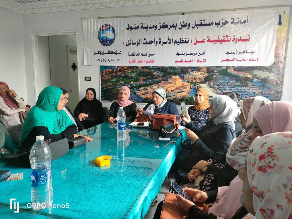 كما نظمت أمانة المرأة بمركز منوف برئاسة سامية السبكي، ندوة تثقيفية بعنوان "تنظيم الأسره وأحدث الوسائل"، في حضور أمينات المرأة بقري مركز ومدينة منوف، بإشراف أحمد قاسم، أمين الحزب بمنوف، حيث حاضر في الندوة الدكتورة بسمة البيه مدير تنظيم الأسره بإداره منوف الطبية، وسط حضور لافت من جانب السيدات والفتيات، الذين طالبوا بتكرار عقد مثل هذه الندوات بكافة القري لتوعية جميع السيدات.