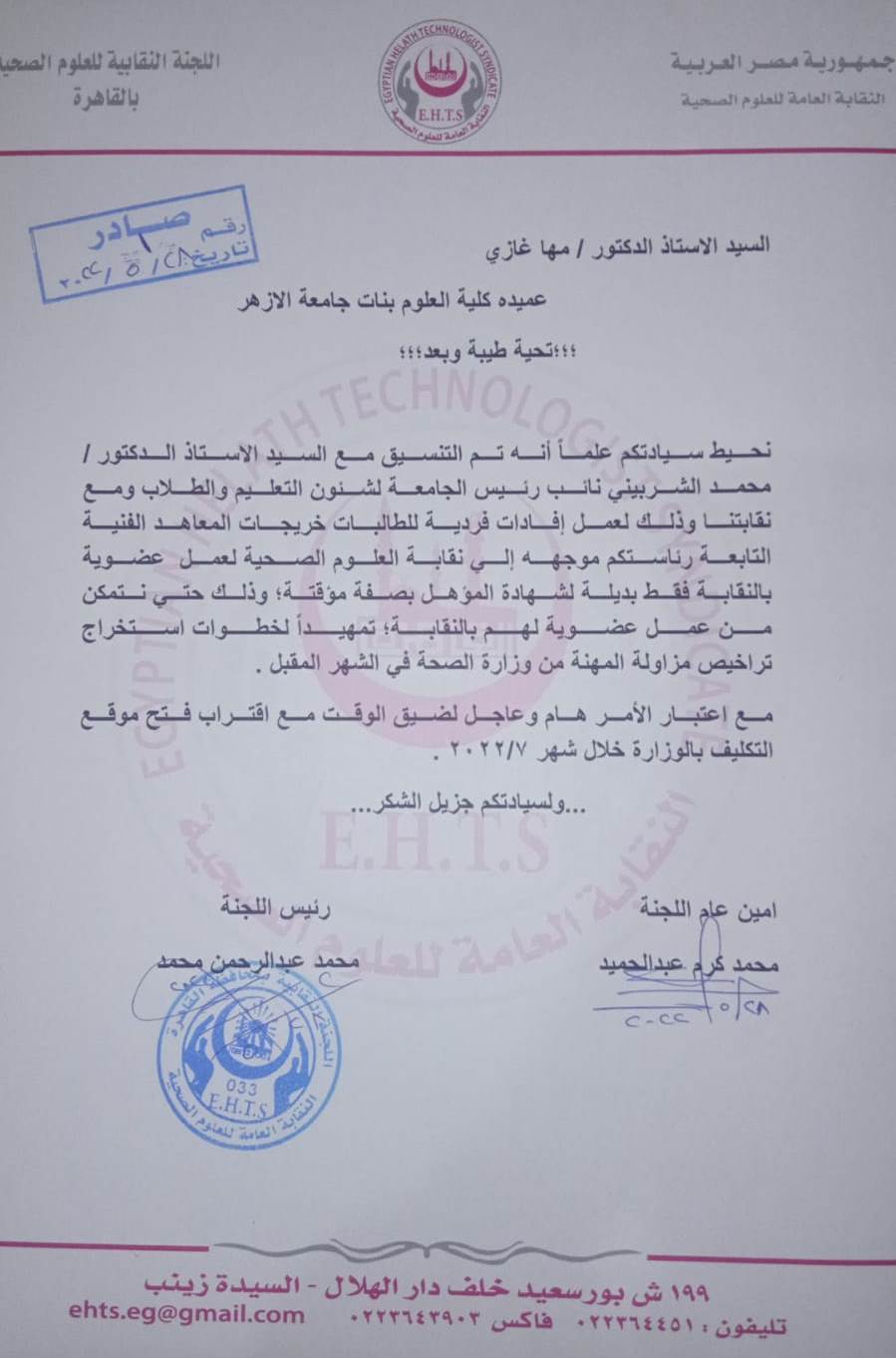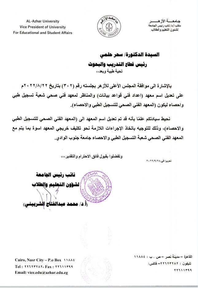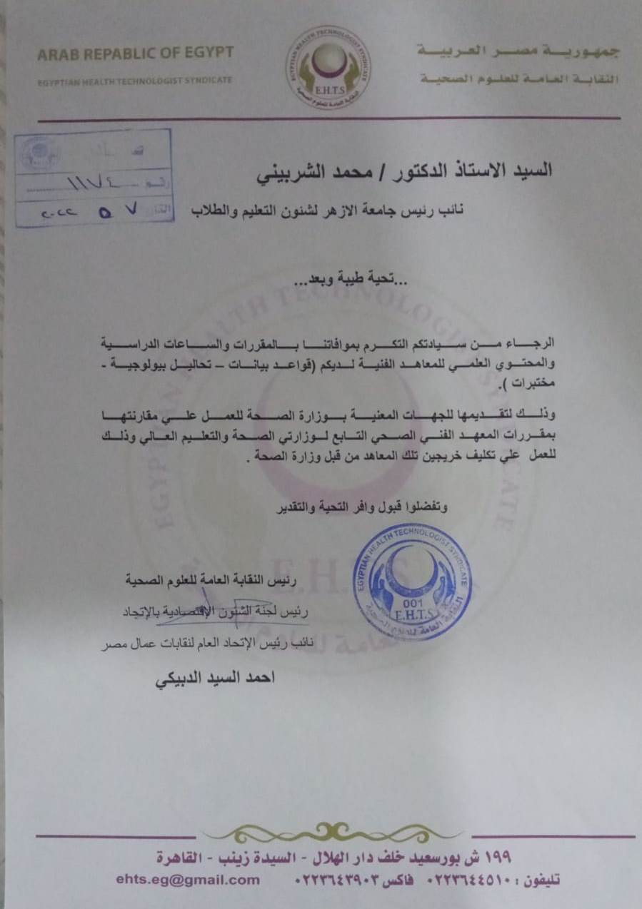 وقال محمد عبدالرحمن، نقيب العلوم الصحية بالقاهرة، أن د. محمد الشربيني، نائب رئيس جامعة الأزهر، خاطب الدكتورة سحر حلمي، بقرار المجلس الأعلى للأزهر، وطالبها بالتوجيه باتخاذ الإجراءات اللازمة، نحو تكليف خريجي المعهد أسوة بما يحدث مع المعهد الفني الصحي شعبة التسجيل الطبي والإحصاء، مشيرا إلى أن ذلك يشمل كافة المعاهد التابعة لكليات العلوم بنين، وبنات أزهر بالقاهرة، وبنين أسيوط، وهم 3 معاهد تحمل اسم "قواعد البيانات"، وتسري القرارات الجديدة في شأنها بعد أن تمت الموافقة على تعديل أسماءها، لينضم الخريجين فعليا إلى صفوف الجيش الأبيض، في خدمة المرضى والمنظومة الصحية داخل وخارج مصر. ولفت إلى أن النقابة كانت قد خاطبت رئيس جامعة الأزهر السابق د. محمد المحرصاوي، في يونيو الماضي، بخصوص تكليف خريجي معاهد قواعد البيانات، للعمل داخل أروقة الجامعة وخارجها، وذلك بالعمل على استصدار قرارات التكليف من وزارة الصحة والسكان، كباقي زملاءهم، حيث توجد مشكلة تواجه خريجي تلك المعاهد، باللجنة العليا للتكليف بالوزارة، وطالبته وقتها بلقاء عاجل لبحث الأمر والتنسيق بشأنه. كما خاطبت النقابة، نائب رئيس جامعة الأزهر، د. محمد الشربيني، في مايو الماضي، لموافاتها بالمقررات والساعات الدراسية والمحتوى العلمي للمعاهد الفنية، لتقديمها لوزارة الصحة، لمقارنتها بمقررات المعهد الفني الصحي، للعمل على تكليف الخريجين من قبل الوزارة. ومن جهتها خاطبت الجامعة، د. هشام زكي، رئيس الإدارة المركزية للخدمات العلاجية غير الحكومية والتراخيص، بكشوف بيانات خريجي المعاهد الفنية التابعة لكليات العلوم، وذلك لاستخراج تراخيص مزاولة مهنة لهم. محمد كرم، الأمين العام لنقابة العلوم الصحية بالقاهرة، قال إن افتتاح معهد قواعد البيانات السابق، كان ضمن عدد من المعاهد التي تم افتتاحها في كلية العلوم 2008، وتم تخرجت أول دفعة منها في 2010، وتوالت الدفعات حتى 2016، وقت تجميد التنسيق لباقي المعاهد سالفة الذكر. وقال أن الدراسة بالمعهد كانت تتبع لوائح قديمة، وتم إعادة فتح المعاهد في عام 2019، مع تعديل اللوائح والمقررات، بعد عدد من الاجتماعات مع قيادات الجامعة والنقابة، وعدد من المخاطبات بين الجهات المعنية، ومنها إدارة التكليف بالوزارة، وإدارة التدريب، ومؤخرا تم مخاطبة الدكتورة سحر حلمي، لتكليفهم خلال بعد الامتياز، وبعد تعديل ومطابقة مقرراتهم توصلت اللجنة المكلفة من الوزارة، إلى أن المقررات معادلة للمعهد الفني الصحي بنسبة 100%، وأوصت بتكليف خريجي المعهد، ولكن جاء رد د. سحر حلمي، بالرفض، معللة بأنهم فئات غير مخاطبة بالتكليف. ولكن مؤخرا، أصدر د. محمد الشربيني نائب رئيس جامعة الأزهر، خطابات لعمداء كليات العلوم التابع لها المعاهد، بتغيير مسمى الشهادات، وسحب القديمة من الخريجين، وتسليمهم شهادات حديثة طبقا لتعليمات شيخ الأزهر، وقرار المجلس الأعلى للأزهر، وتم التصديق بالموافقة على القرار لاستخراج مزاولة مهنة من قبل الصحة. وتقدمت النقابة العامة للعلوم الصحية، بالشكر والتقدير لفضيلة الإمام الأكبر الدكتور أحمد الطيب، لتدخله لحل معضلة الخريجين التي امتدت لسنوات، وتواصل الشكر والتقدير للدكتور خالد عبدالغفار وزير الصحة، آملين استمرار مزيد من التواصل في عدد من المفات ذات الأهمية لأبناء العلوم الصحية، ومنها حذف كلمة تكنولوجيا من مسمى الكلية، وبالتالي من اسم الشهادة، وكذلك المسمى الوظيفي لخريجي البكالوريوس، وخاصة أنهم يدرسون مواد طبية وصحية، وليس لها علاقة من قريب أو بعيد بالمجال التكنولوجي الصناعي، كما يحاول البعض إلصاقها به.