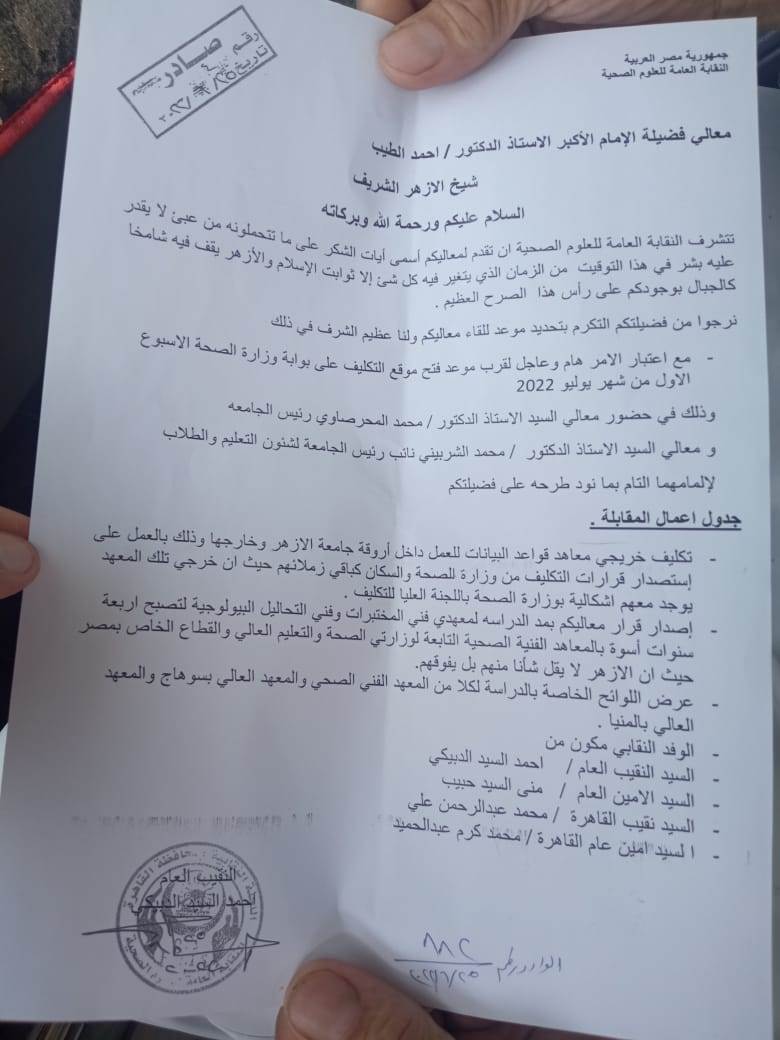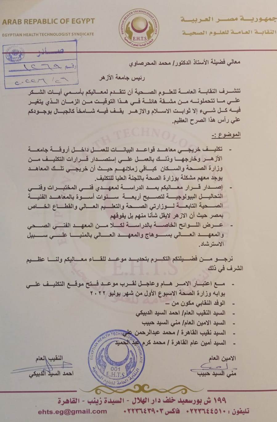 وأشار إلى أن الطلبة التقوا بالإمام الأكبر في بلده بالأقصر، وشرحوا له كافة التفاصيل، وحجم أزمتهم، واحتوى فضيلته الأزمة وبادر بحلها على الفور، وكانت النقابة قد خاطبته سابقا بخصوص نفس المشكلة، وطلبت لقاءا عاجلا، وهو ما كان فاعلا في اتخاذ القرارات الأخيرة لصالح خريجي العلوم الصحية، كما طالبت النقابة فضيلة الإمام الأكبر، بإصدار قرار بمد الدراسة للمعاهد الفنية بالجامعة، لتصبح 4 سنوات، أسوة بأقرانهم في المعاهد الفنية الصحية، التابعة لوزارتي الصحة والتعليم العالي، والقطاع الخاص.