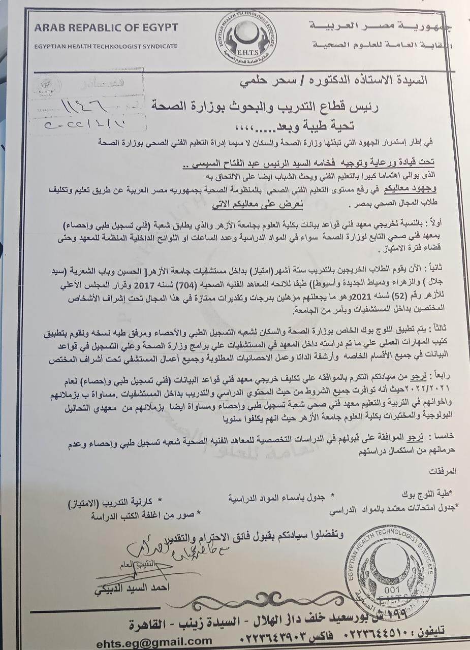 ولفتت منى حبيب، أمين عام نقابة العلوم الصحية، إلى أن النقابة خاطبت الدكتورة سحر حلمي، رئيس قطاع التدريب والبحوث بوزارة الصحة، في إبريل الماضي، بخصوص خريجي معهد قواعد البيانات بكلية العلوم جامعة الأزهر، والذي يطابق شعب التسجيل الطبي والإحصاء بالمعاهد الفنية الصحية، سواء في المواد الدراسية، أو عدد الساعات، واللوائح الداخلية المنظمة للمعهد، وحتى قضاء فترة الامتياز، حيث يقوم الطلاب بالتدريب 6 أشهر بداخل مستشفيات جامعة الأزهر في "الحسين، باب الشعرية، الزهراء، دمياط الجديدة، وأسيوط"، طبقا للائحة المعاهد الفنية الصحية رقم 704 لسنة 2017، وقرار المجلس الأعلى للأزهر رقم 52 لسنة 2021، وهو ما يجعلهم مؤهلين بدرجات وتقديرات ممتازة في هذا المجال. كما يتم تطبيق "اللوج بوك" الخاص بوزارة الصحة لشعبة التسجيل الطبي والإحصاء، ويتم تطبيق كتيب المهارات العملي على ما تم دراسته داخل المعهد في المستشفيات على برامج وزارة الصحة، وعلى التسجيل في قواعد البيانات في جميع الأقسام الخاصة، وأرشفة الداتا، وعمل الإحصائيات المطلوبة، وجميع أعمال المستشفى، تحت إشراف المختص. وقالت منى حبيب، أن النقابة طالبت في مخاطباتها للصحة، بالموافقة على تكليف خريجي معهد فني قواعد البيانات "فني تسجيل طبي وإحصاء"، حيث توافرت جميع الشروط من حيث المحتوى الدراسي، والتدريب، مساواة بزملائهم في التعليم العام بالمعهد الفني الصحي شعبة التسجيل الطبي والإحصاء.