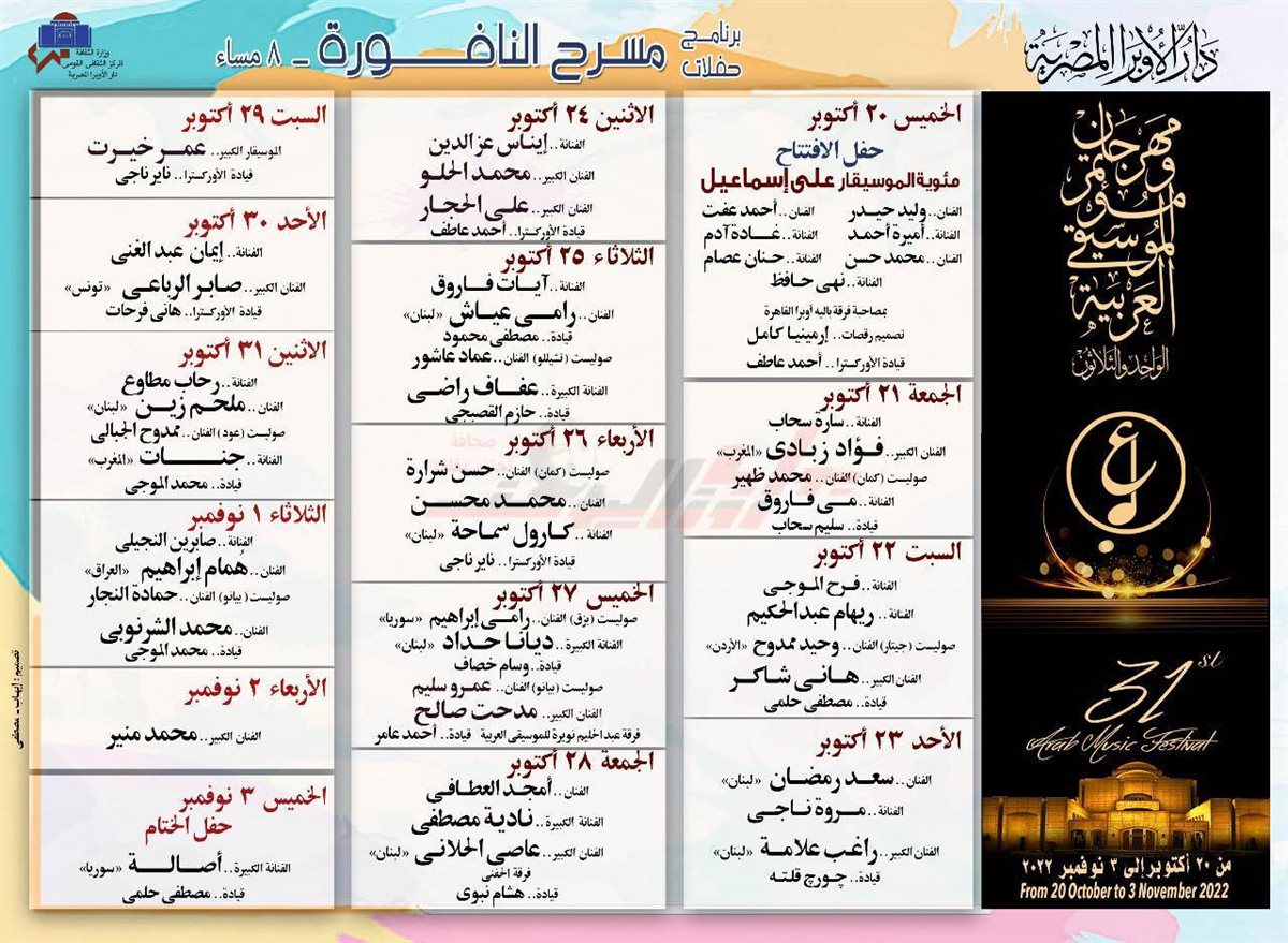 يذكر أن فعاليات الدورة 31 من مهرجان ومؤتمر الموسيقى العربية يتواصل لمدة 15 يوما متتالية فى الفترة من 20 أكتوبرحتى 3 نوفمبر المقبل ويضم 39 حفل غنائى وموسيقى بمشاركة 99 فنان من 9 دول عربية هى مصر، المغرب، الأردن، لبنان، سوريا، العراق، البحرين، السعودية، تونس، ويقام على مسارح الاوبرا المختلفة بالقاهرة ( النافورة، الصغير، معهد الموسيقى العربية، الجمهورية )، مسرح سيد درويش ( اوبرا الإسكندرية ) واوبرا دمنهور هذا الى جانب المؤتمر العلمى الذي يعقد في الفترة من 22 إلى 26 أكتوبر ويناقش موضوع المسرح الغنائي علامات فارقة في مسيرة الموسيقى العربية من خلال 7 محاور هى نشأة المسرح الغنائي العربي وازدهاره، رواد التلحين والأداء فى المسرح الغنائي المصري، رواد المسرح الغنائي المصري منذ منتصف القرن العشرين وحتى الآن، التجارب الإبداعية للمسرح الغنائي فى البلاد العربية، المسرح الغنائي العربي بين المعالجة الدرامية والرؤية الموسيقية، تجارب مستحدثة فى المسرح الغنائي العربي، قضايا جمع وتوثيق وإحياء المسرح الغنائي العربي، بالاضافة الى المسابقة الفنية التي تحمل اسم الدكتورة رتيبة الحفنى في الغناء للشباب والاطفال وذوى القدرات الخاصة والتميز للهواه في العزف المنفرد على جميع الآلآت الموسيقية، الى جانب معرضا لفنون الخط العربى للفنان المكرم محمد يوسف عبد اللطيف المغربي بقاعة صلاح طاهر.