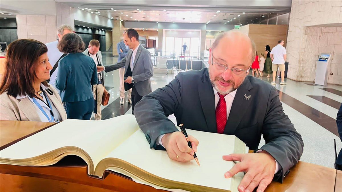 وفي نهاية الزيارة، حرص السيد مارتن شولتز على تسجيل كلمة شكر وتقدير بدفتر زيارات المتحف، وقدم الدكتور أحمد غنيم، للسيد مارتن شولتز والوفد المرافق، مجموعة من الهدايا التذكارية.