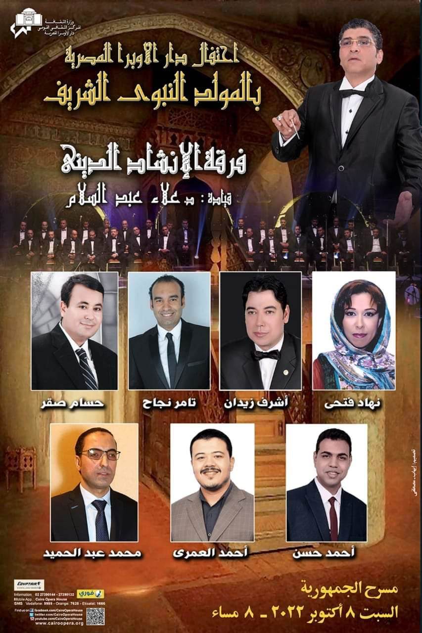 بمناسبة الذكرى العطرة للمولد النبوى الشريف تنظم دار الأوبرا المصرية برئاسة الدكتور مجدي صابر، حفلين لفرقة الانشاد الدينى بقيادة المايسترو علاء عبدالسلام، وذلك فى الثامنة مساء السبت 8 أكتوبر على مسرح الجمهورية، ومساء الأحد 9 أكتوبر على مسرح أوبرا دمنهور.