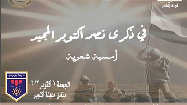ضمن خطة نشاط وزارة الثقافة، وتحت رعاية الدكتورة نيفين الكيلاني، وزيرة الثقافة؛ يعقد المجلس الأعلى للثقافة بأمانة الدكتور هشام عزمي؛ أمسية شعرية في ذكرى نصر أكتوبر المجيد، والتي تنظمها لجنة الشعر برئاسة الشاعر أحمد سويلم وبالتعاون مع الأستاذ أحمد عبدالنبي مدير نادي الأدب بنادي السادس من أكتوبر، وذلك في تمام الخامسة من مساء غد الجمعة الموافق 7 أكتوبر الحالي؛ بمقر نادي مدينة السادس من أكتوبر.