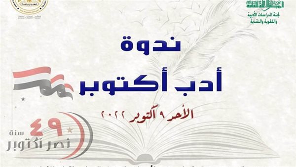 ضمن خطة نشاط وزارة الثقافة بمناسبة ذكرى انتصارات اكتوبر المجيدة، وتحت رعاية الدكتورة نيفين الكيلاني وزيرة الثقافة؛ ينظم المجلس الأعلى للثقافة بأمانة الدكتور هشام عزمي؛ ندوة "أدب أكتوبر"، التي تنظمها لجنة الدراسات الأدبية واللغوية والنقدية بالمجلس ومقررها الدكتور عبد الرحيم الكردي، وذلك في تمام السادسة مساء غد الأحد الموافق 9 أكتوبر الحالي بقاعة الفنون بالمجلس الأعلى للثقافة.