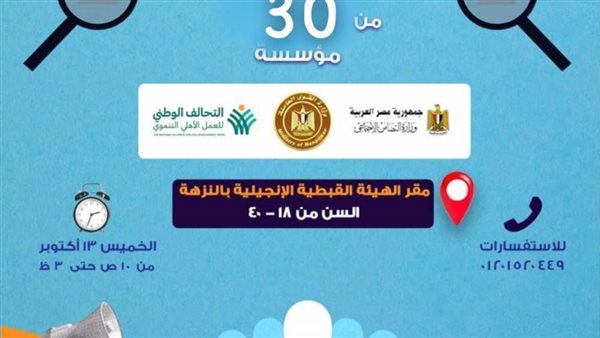 تنظم وزارة القوى العاملة بالتعاون مع الهيئة القبطية الإنجيلية للخدمات الاجتماعية، غدا الخميس الموافق 13 أكتوبر ، ملتقى توظيف للشباب بمشاركة 30 شركة قطاع خاص تُوفر 3 آلاف فرصة عمل للشباب بتخصصات مختلفة، لجميع المؤهلات، على أن يكون السن من 18-40 عاماً ، ودعت "الوزارة" ، الشباب الراغب في الحصول على فرصة عمل التواجد غدا الخميس بمقر الهيئة القبطية الإنجيلية بالعنوان: "مربع 1331 " شارع د.أحمد زكي، النزهة الجديدة، بجوار محلات بنجو ".