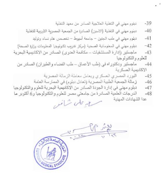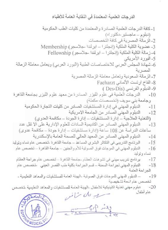 نشرت نقابة الأطباء الدبلومات والبرامج التدريبية المعتمدة لديها، وتناشد مراجعتها قبل الالتحاق بأي برامج معلن عنها، نظراً لاستفسار عديد من الأطباء عن اعتماد بعض الدبلومات والبرامج المعلن عنها بوسائل التواصل الاجتماعي وغيرها، حيث تمت المراجعة لجميع الدرجات العلمية والدبلومات المهنية والبرامج التدريبية المعتمدة من النقابة العامة للأطباء، وتناشد أعضاءها المراجعة قبل الاشتراك في أي دبلومات أو برامج معلن عنها من خارج آليات النقابة العامة للأطباء.