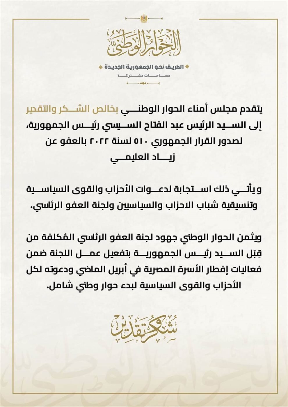 تقدم مجلس أمناء الحوار الوطني بخالص الشكر والتقدير إلى الرئيس عبدالفتاح السيسي، رئيس الجمهورية، لصدور القرار الجمهوري ٥١٠ لسنة ٢٠٢٢ بالعفو عن زياد العليمي.