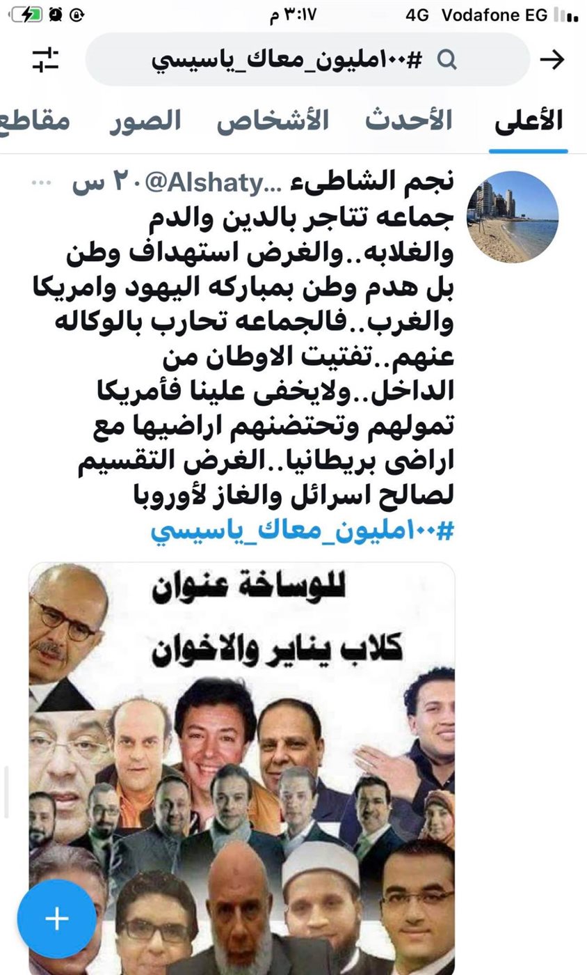 تصدر هاشتاج "100 مليون_معاك_يا سيسي"، موقع التواصل الاجتماعي تويتر اليوم، وذلك بعد ملاحظة دعوات تحريضية ضد الدولة المصرية أطلقتها جماعة الإخوان الإرهابية عبر أذرعها الهاربة بالخارج ولجانها الإلكترونية.