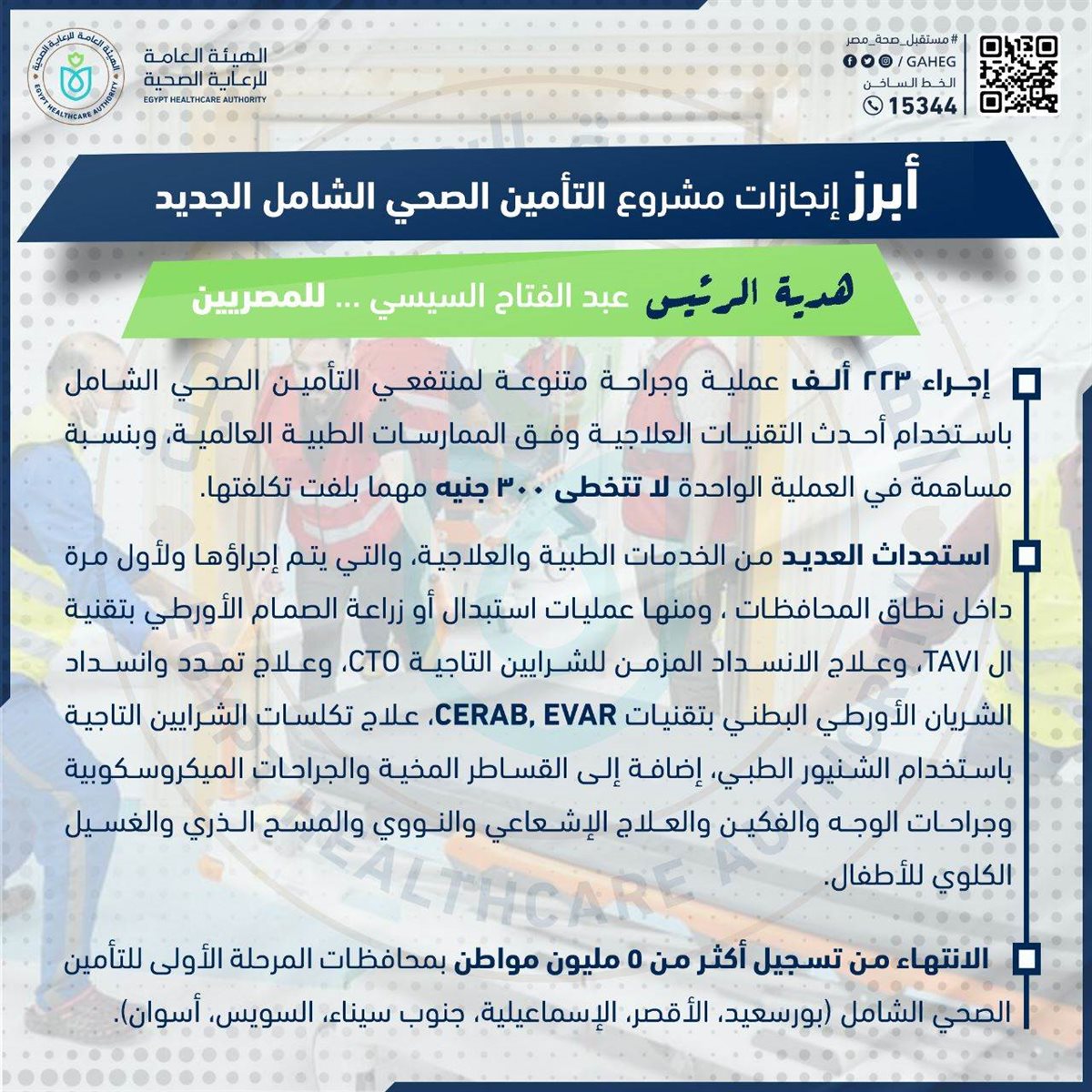 بعد مرور 3 سنوات من إطلاق رئيس جمهورية مصر العربية، الرئيس عبد الفتاح السيسي القائد التاريخي للإصلاح الصحي الشامل في مصر، لمنظومة التأمين الصحي الشامل الجديدة، وذلك من محافظة بورسعيد في يوليو 2019 ، معلنًا تشغيل المنظومة رسميًا في نوفمبر من ذات العام، أعلنت الهيئة العامة للرعاية الصحية، برئاسة الدكتور أحمد السبكي رئيس مجلس إدارة الهيئة، المشرف العام على مشروع التأمين الصحي الشامل الجديدة، عن أبرز إنجازات الهيئة، باعتبارها ذراع الدولة الرئيسي في ضبط وتنظيم تقديم خدمات منظومة التأمين الصحي الشامل الجديدة، والتي شملت:-