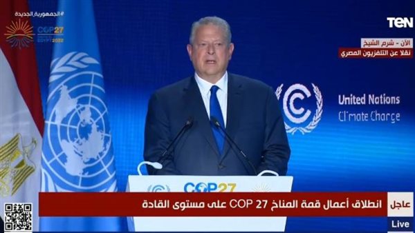 شهدت فاعليات الشق الرئاسي من الدورة السابعة والعشرين لمؤتمر الأطراف لاتفاقية الأمم المتحدة الإطارية بشأن المناخ "cop27" بشرم الشيخ، كلمة لنائب رئيس الولايات المتحدة الأمريكية الأسبق آل جور.