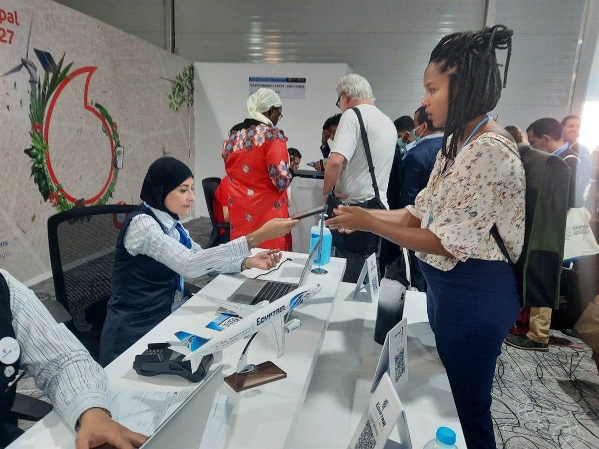 شهد جناح مصرللطيران خلال فعاليات اليوم الأول في مؤتمر المناخ COP27 بالمنطقة الزرقاء المخصصة للخدمات إقبالًا من المشاركين بالمؤتمر من مختلف الدول، وذلك للاستفسار عن خدمات مصر للطيران والاطلاع على برامجها المقدمة لضيوف المؤتمر وتعديل ومراجعة حجوزاتهم على رحلات مصر للطيران الدولية والداخلية، والاشتراك في برنامج المسافر الدائم.