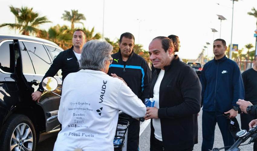 قام الرئيس عبدالفتاح السيسي بجولة تفقدية، فجر اليوم الخميس، بالدراجة في مدينة شرم الشيخ، تفقد خلالها المنطقة الخضراء الصديقة للبيئة، والتي تشهد العديد من الفعاليات والأنشطة خلال انعقاد القمة العالمية للمناخ.