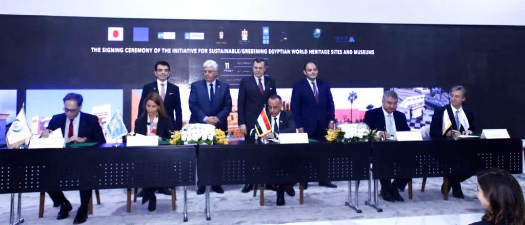 شهد، اليوم، أحمد عيسى وزير السياحة والآثار، والمهندس أحمد سمير وزير التجارة والصناعة، والدكتور أيمن عاشور وزير التعليم العالي والبحث العلمي، مراسم توقيع مذكرة التفاهم الإطارية لمشروع تحويل المتاحف ومواقع التراث العالمي المصري إلى الأخضر واستخدام الطاقة الشمسية، وذلك التوقيع بين المجلس الأعلى للآثار، وبرنامج الأمم المتحدة الإنمائي UNDP، ومركز تحديث الصناعة IMC (مشروع نظم الخلايا الشمسية الصغيرة)، ومنظمة الأمم المتحدة للتربية والعلم والثقافة (اليونسكو)، ومنظمة العالم الإسلامي للتربية والعلوم والثقافة (الإيسيسكو).