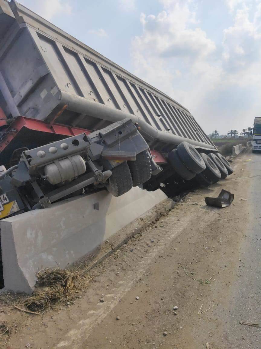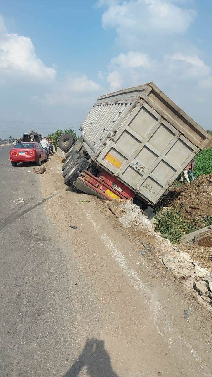 وانتقل ضباط مباحث المركز وسيارات الإسعاف لمكان الحادث، وتبين انقلاب شاحنة نقل ثقيل تحمل لوحات معدنية رقم "د ج ل 2827" و"د ا ق 4952".