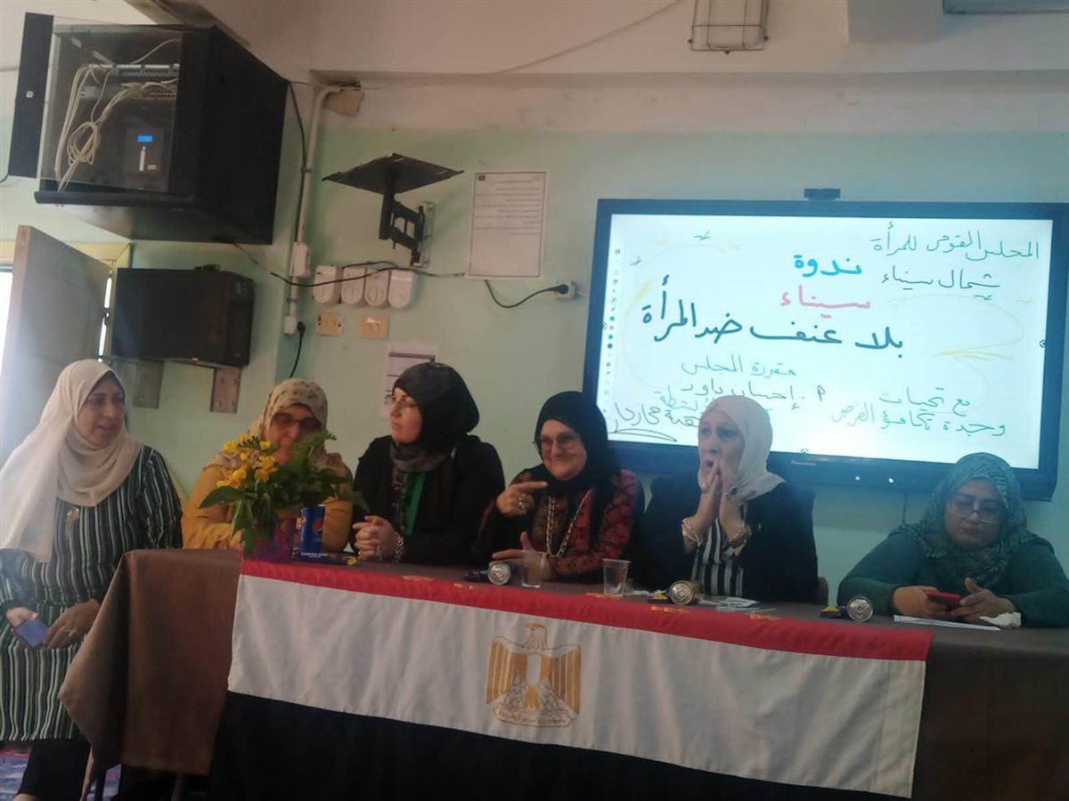 نظم فرع المجلس القومى للمرأة بشمال سيناء تحت رعاية الدكتورة مايا مرسى رئيس المجلس القومى للمرأة وتحت إشراف ورئاسة إحسان داود غالى مقررة الفرع (اليوم الخميس) ندوة تحت عنوان: "سيناء بلا عنف".. حيث كان عنوان أول فاعلية: "العنف ضد المرأة وأشكاله"، وذلك بمدرسة الشهيد الواء أحمد عسكر الثانوية للبنات بحضور فاطمة نصار عضوة الفرع ومروة عبدالعزيز رئيس وحدة تكافؤ الفرص بمديرية التربية والتعليم ونسرين حمدى بكير محامية مكتب الشكاوى بالفرع ، وبحضور عدد (٧٥) طالبة ومعلمتين ومشرفة الأنشطة.