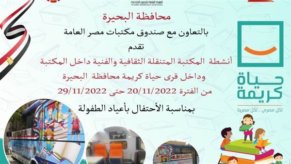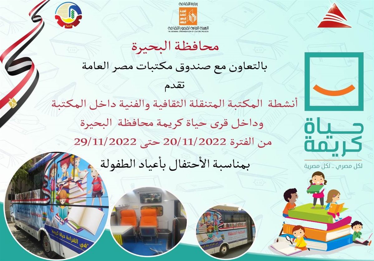 تستقبل مكتبة مصر العامة بدمنهور بالتعاون مع صندوق مكتبات مصر العامة، أتوبيس المكتبة المتنقلة "الأتوبيس المتنقل" في جولة جديدة تستمر لمدة 10 أيام متصلة بدايةً من غد الأحد 20 نوفمبر و حتى الثلاثاء 29 نوفمبر 2022، تحت رعاية الدكتور نهال بلبع نائب محافظ البحيرة، وبمناسبة احتفالات المحافظة بعيد الطفولة الذي يوافق 20 من نوفمبر الجارى.