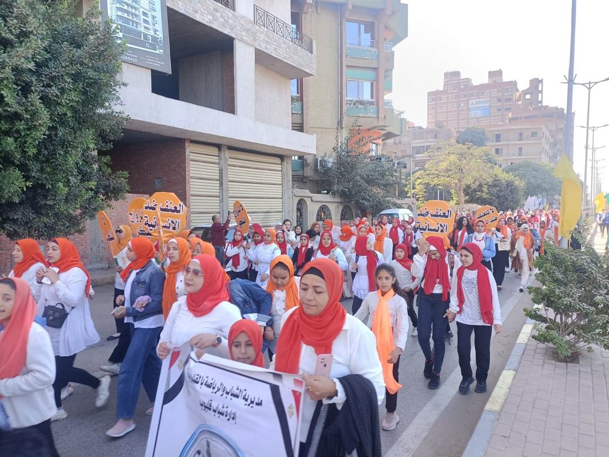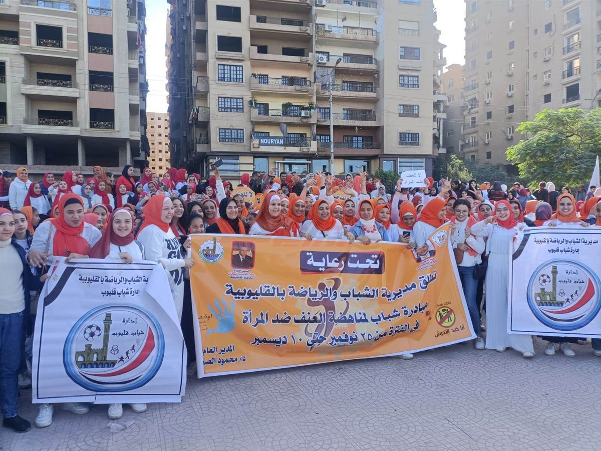 وانطلقت المسيرة من أمام ديوان عام محافظة القليوبية حتى حديقة صقلية بالفلل بمدينة بنها بمشاركة 500 فتاة من عضوات أندية الفتاة والمرأة على مستوى المحافظة وكذا مسيرة بالمراكب النيلية، وأعضاء الأندية الثقافية، مشروع 1000 بنت 1000 حلم، والأندية الرياضية للمرأة ، وأعضاء أندية التطوع والكشافة والجوالة وأعضاء فريق شباب يدير شباب yly بالقليوبية. يكسوها اللون البرتقالي، ويتقدمها شباب رافعون لافتات لمناهضة العنف ضد المرأة ونبذ الزواج المبكر لتشجيع الشباب على الإيمان بحقوق المرأة وتسليط الضوء على عدد من القضايا التي تهدد استقرارها، وفي ختام المسيرة قدم نادي الفنون التابع لإدارة الشباب بالمديرية عرضا فنيا قصيرا إعلانا لبدء فاعليات تستمر على مدى 16 يوما.