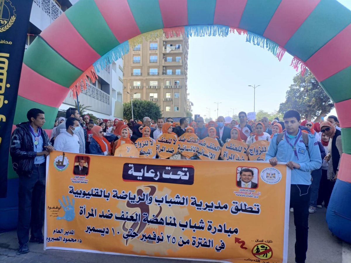 أطلق اللواء عبدالحميد الهجان، محافظ القليوبية، صباح اليوم الجمعة، إشارة بدء مسيرة شبابية التي أطلقتها مديرية الشباب والرياضة بالقليوبية ضمن فاعليات مبادرة شباب لمناهضة العنف ضد المرأة تزامنا مع اليوم العالمي لمناهضة العنف ضد المرأة، والذي يمثل 16 يوم من النشاط تبدأ يوم الجمعة 25 نوفمبر حتى 10 ديسمبر وهو اليوم العالمي لحقوق الإنسان؛ حيث سيتم عقد سلسلة من الندوات بعدد من مراكز الشباب على مستوى المحافظة، وورش عمل لتدريب الفتيات على أساليب الدفاع عن النفس.