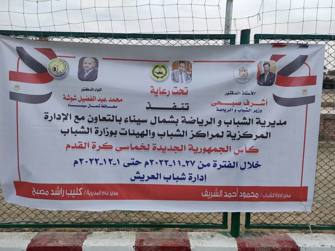 تحت رعاية الدكتور أشرف صبحى وزير الشباب والرياضة والدكتور محمد عبد الفضيل شوشة محافظ شمال سيناء.. انطلقت اليوم أولى مباريات كأس الجمهورية الجديدة لخماسى كرة القدم بمحافظة شمال سيناء، وذلك بحضور : كليب راشد مدير عام مديرية الشباب والرياضة بشمال سيناء، حسبن العايق مدير إدارة شباب العريش، محمود الشريف مدير إدارة خدمات الشباب، ومديرى المراكز المشاركة في المسابقة.