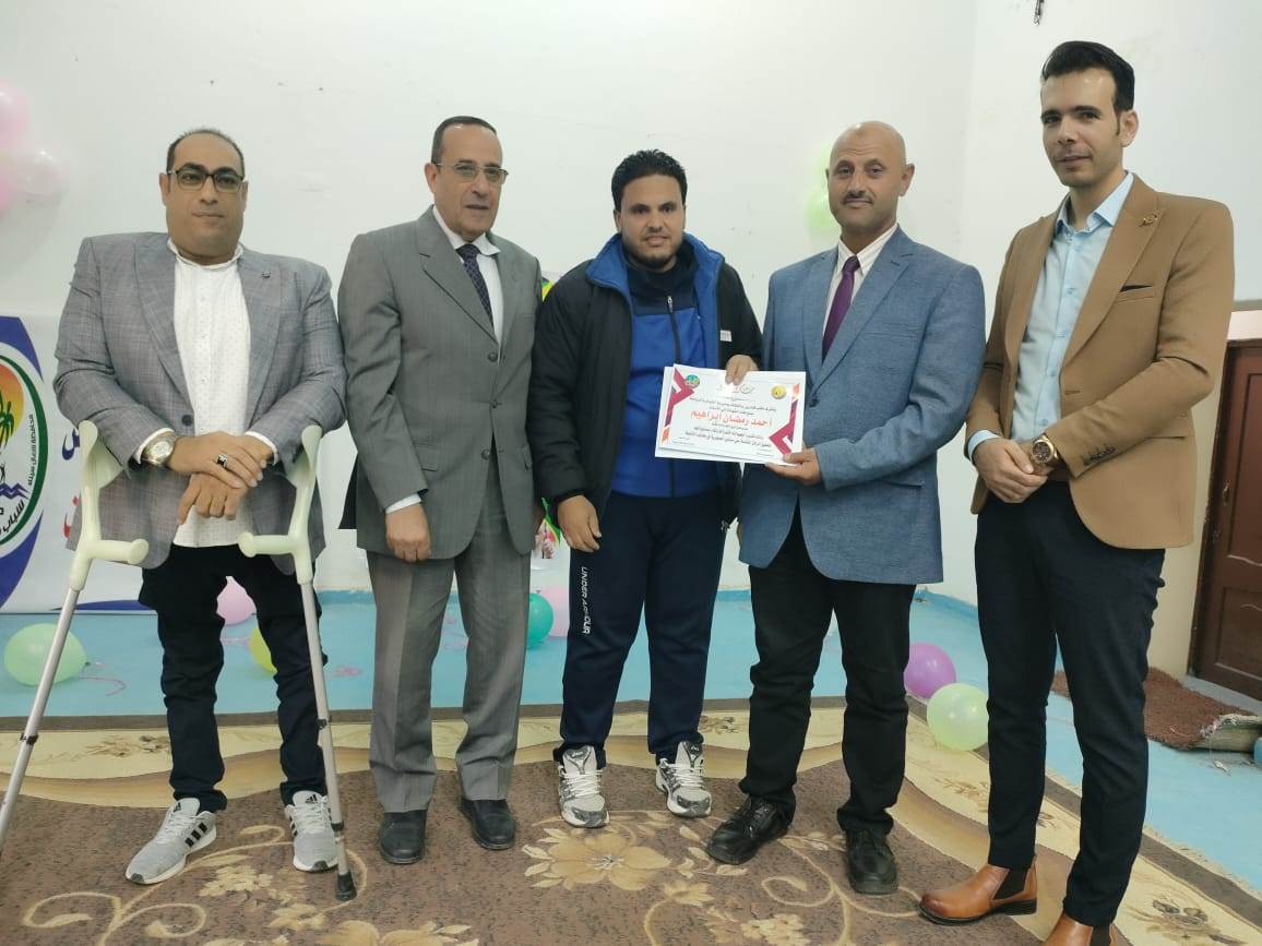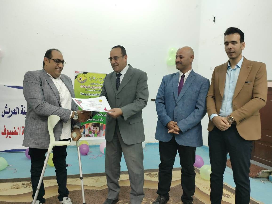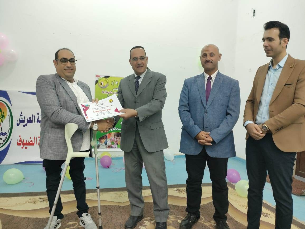 كما تم تكريم كل من: حسن صالح مصباح رئيس مجلس إدارة نادى المعاقين بالعريش، ناصر العزازى مدير مركز شباب العريش، ومدحت سعد مدير شباب نادى 6 أكتوبر بالعريش.