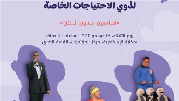 تُنظم مكتبة الإسكندرية من خلال وحدة برامج ذوي الاحتياجات الخاصة بقطاع مكتبات؛ احتفالًا باليوم العالمي لذوي الاحتياجات الخاصة بعنوان (قادرون بدون لكن)، وذلك يوم الثلاثاء الموافق 13 ديسمبر 2022 في تمام الساعة الحادية عشرة صباحاً بالقاعة الكبرى بمركز مؤتمرات مكتبة الإسكندرية. والاحتفالية تسلط الضوء على مجموعة الموهوبين من ذوي الاحتياجات الخاصة من خلال تقديمهم لعروض فنية مختلفة تهدف المكتبة إلى إبراز قدراتهم، وتقديم خدمات متنوعة لهم وخصوصًا للأطفال