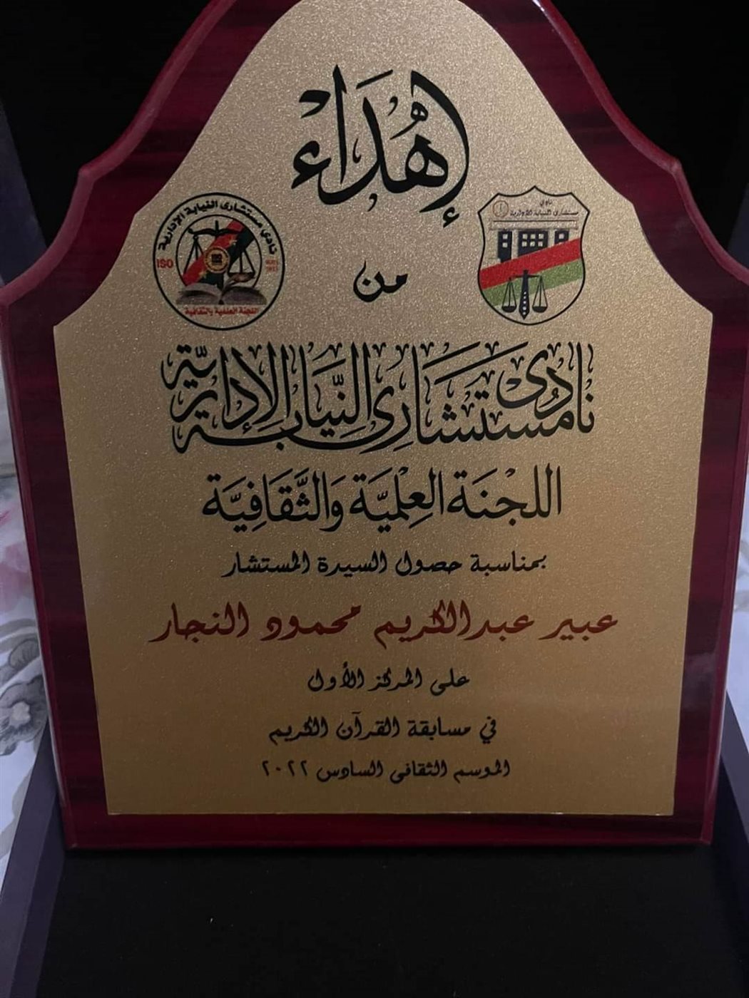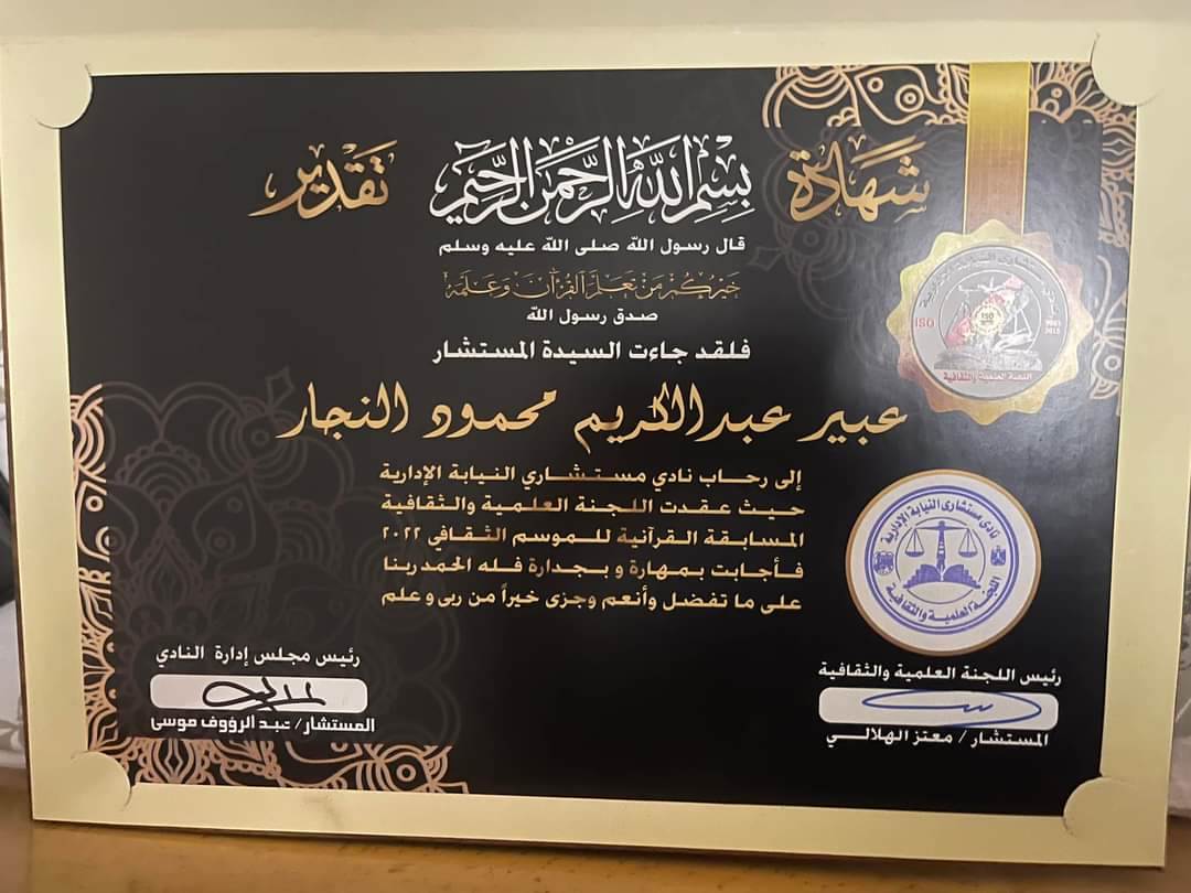 كرمت هيئة النيابة الإدارية برئاسة المستشار عدلي جاد، رئيس الهيئة المستشارة عبير عبد الكريم محمود النجار، ابنه محافظة سوهاج لفوزها بالمركز الأول عن فئة الإنشاد الديني بمسابقة القرآن الكريم السنوية التي تنظمها اللجنة العلمية والثقافية بنادي مستشاري النيابة الإدارية عن الموسم الثقافي السادس ٢٠٢٢ م وذلك بمقر النادي بالقاهرة.