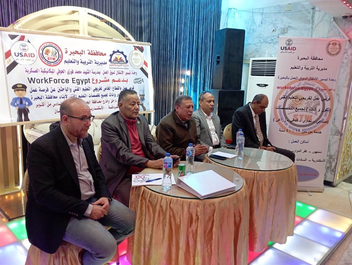 رافق وكيل الوزارة بكساوى مصطفى وكيل المديرية والمهندس محمود الزرقا مدير عام التعليم الفنى والدكتور خالد برديسى مدير مكتب مشروع قوى عاملة مصر بالبحيرة، صالح نجدى مدير وحده الانتقال لسوق العمل بالمديرية وعدد كبير من ممثلي كبرى شركات القطاع الخاص وأعضاء وحدة تيسير الانتقال لسوق العمل بالمديرية.