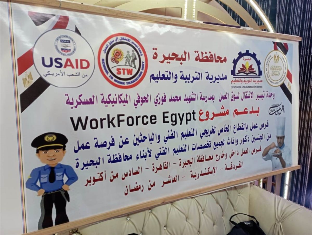 شهد يوسف الديب وكيل وزارة التربية والتعليم بالبحيرة اليوم فعاليات اليوم التوظيفى السابع لتوظيف وتشغيل شباب الخريجين بمحافظة البحيرة الذي نظمته وحدة الانتقال لسوق العمل بمديرية التربية والتعليم بالبحيرة المدعومة من مشروع قوى عاملة مصر الممول من الوكالة الأمريكية للتنمية الدولية في إطار رؤية مصر ٢٠٣٠، وذلك بمقر نقابة المعلمين بدمنهور وتنظيم من مدرسة الشهيد محمد فوزي الحوفى الميكانيكية العسكرية.