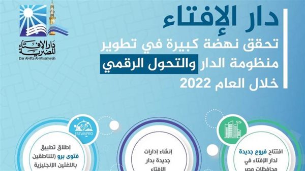 سعيًا لاستشراف المستقبل، ومن أجل حسن الاستعداد لمواجهة مستجداته وأحداثه، واتِّخاذ الأسباب اللازمة لمواكبة تطوراته دون الإخلال بمتطلبات الحاضر، شهد عام 2022 تطورًا وجهودًا كبيرة لدار الإفتاء المصرية وخطواتٍ جادةً من أجل تقديم خدماتها للجمهور وتعزيز حضورها وتواصلها مع المستفتين، ورغبةً في الاستعداد الجيد للمستقبل، ومن أجل التحول الرقمي، ومن خلال هذه الإطلالة السريعة نبرز أهم إنجازات التطور المؤسسي لمنظومة العمل في دار الإفتاء المصرية في العام 2022.