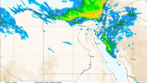 ويتوقع الأرصاد الجوية، سقوط أمطار متوسطة الشدة نهارا وقد تكون غزيرة مساء على مناطق من السواحل الشرقية وشمال سيناء وشمال الوجه البحرى، أما بالنسبة للسواحل الشمالية الغربية فمن المتوقع سقوط أمطار متوسطة الشدة.