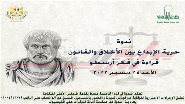 ضمن خطة نشاط وزارة الثقافة، وتحت رعاية الدكتورة نيفين الكيلاني وزيرة الثقافة؛ وبأمانة الدكتور هشام عزمي؛ والكاتب محمد ناصف رئيس الإدارة المركزية للشعب واللجان الثقافية، يعقد المجلس الأعلى للثقافة، ندوة بعنوان "حرية الإبداع بين الأخلاق والقانون: قراءة في فكر أرسطو"، والتي تنظمها لجنة حماية الملكية الفكرية بالمجلس ومقررها الدكتور حسام لطفي؛ وذلك في تمام الخامسة مساء اليوم الأحد 25 ديسمبر الحالي؛ بقاعة المجلس.
