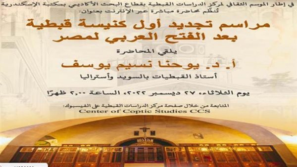 تنظم مكتبة الإسكندرية في إطار الفعاليات والأنشطة العلمية والثقافية التي ينظمها مركز الدراسات القبطية، ثالث محاضرات الموسم الثقافي القبطي الثالث عشر، بعنوان "مراسم تجديد أول كنيسة قبطية بعد الفتح العربي لمصر"، والتي يحاضر فيها الأستاذ الدكتور يوحنا نسيم يوسف أستاذ القبطيات بالسويد وأستراليا، وذلك عن طريق البث عن بُعد “Online”، يوم الثلاثاء الموافق 27 ديسمبر 2022، الساعة 2.00 ظهرًا.