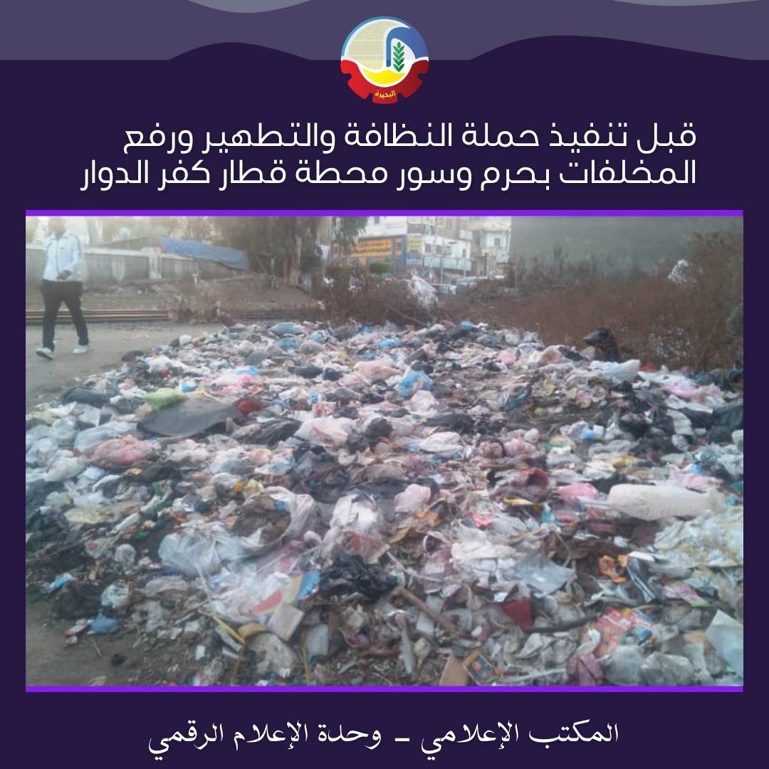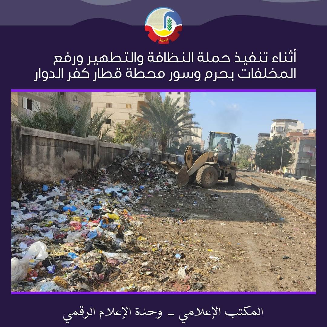 وقامت الوحدة المحلية لمركز ومدينة كفر الدوار بتنفيذ حملة لرفع التراكمات على حرم السكة الحديد وداخل الأسوار بنطاق المدينة وبجوار مزلقان السعرانية، بالإضافة لتنفيذ حملة مكافحة وتطهير بذات المناطق عقب رفع التجمعات بالتنسيق مع الصحة تم خلالها رش ومكافحة الحشرات.
