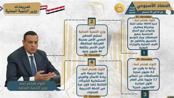 نشرة الحصاد الأسبوعي لرصد أنشطة وزارة التنمية المحلية في الفترة من 24 إلى 30 ديسمبر الجاري.