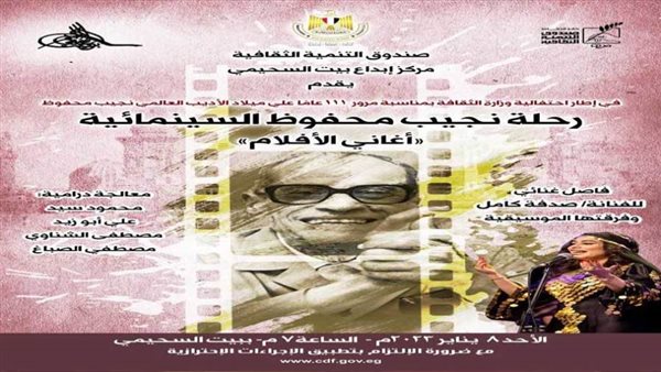 ضمن احتفالات وزارة الثقافة بالذكرى 111 لميلاد الأديب العالمي نجيب محفوظ، يستضيف مركز إبداع بيت السحيمي بشارع المعز، التابع لقطاع صندوق التنمية الثقافية، أمسية ثقافية بعنوان "رحلة نجيب محفوظ السينمائية.. أغاني الأفلام" في السابعة مساء الأحد 8 يناير 2023.