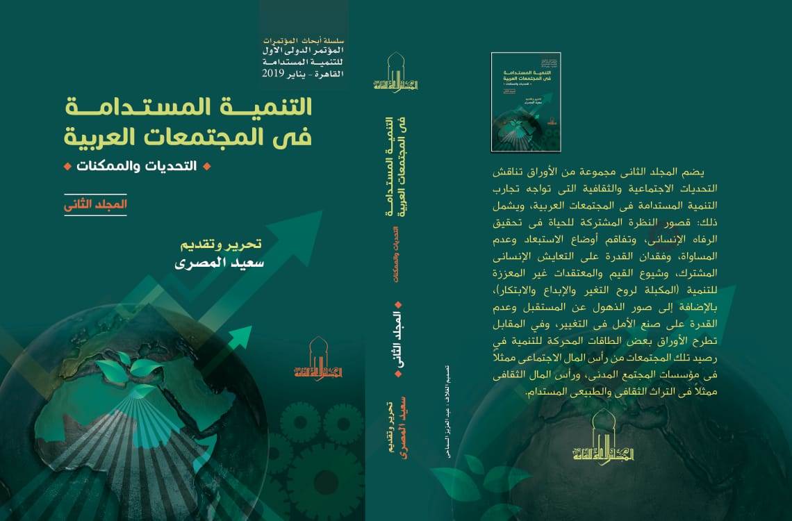 وجاء الإصدار فى أربعة أجزاء وكان المجلد الأول تحت عنوان "التنمية المستدامة وبناء الإنسان.. إطلالة نظرية"، والجزء الثانى بعنوان "التنمية المستدامة فى المجتمعات العربية.. التحديات والممكنات"، والجزء الثالث بعنوان "التنمية المستدامة وقضايا الهوية والتنوع الثقافى".