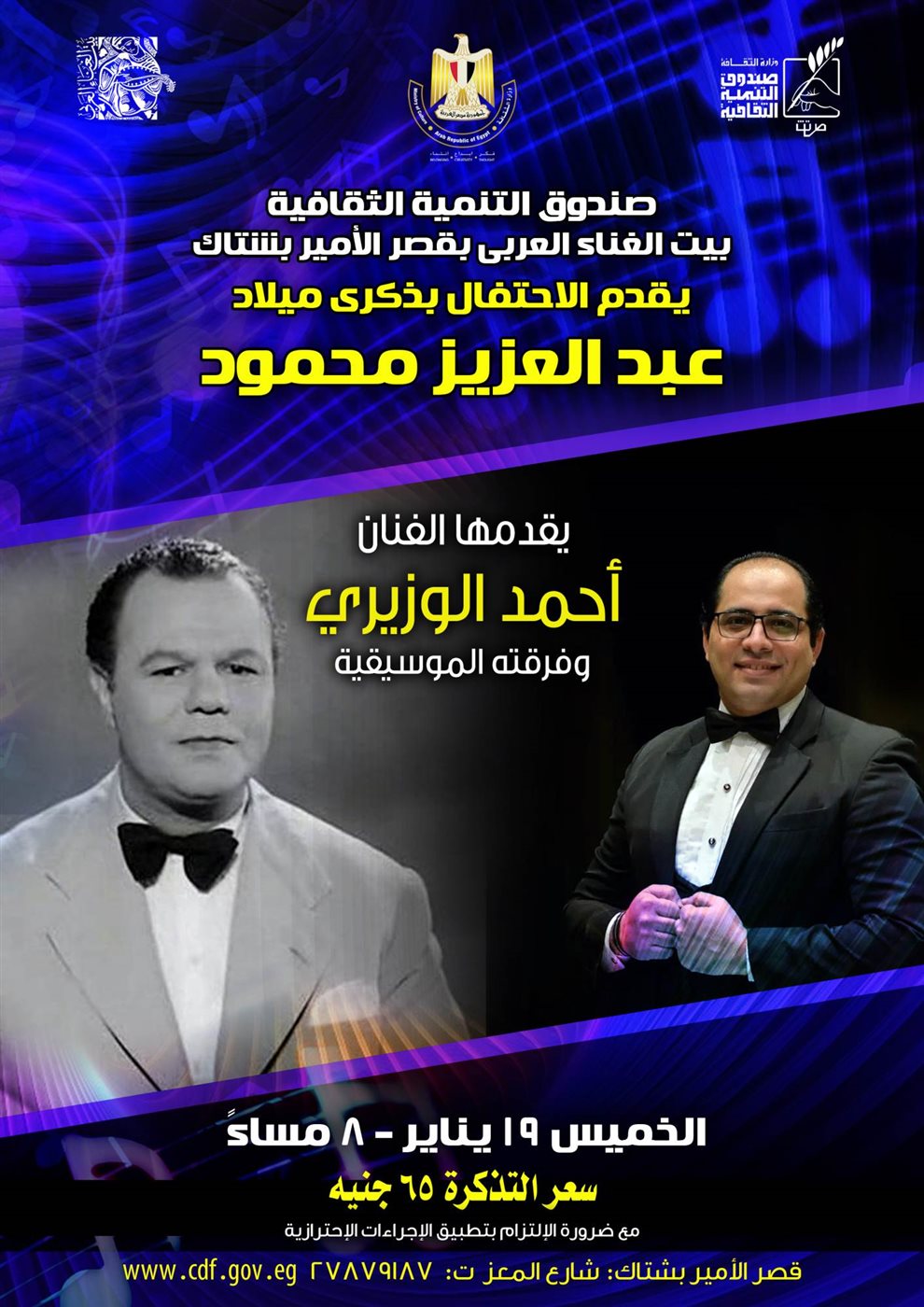 بمناسبة ذكرى ميلاد الفنان الكبير عبد العزيز محمود، يقيم بيت الغناء العربي "قصر الأمير بشتاك"، التابع لقطاع صندوق التنمية الثقافية، حفلا غنائيا يقدمه الفنان أحمد الوزيري وفرقته الموسيقية، وذلك في الثامنة مساء الخميس 19 يناير 2023.