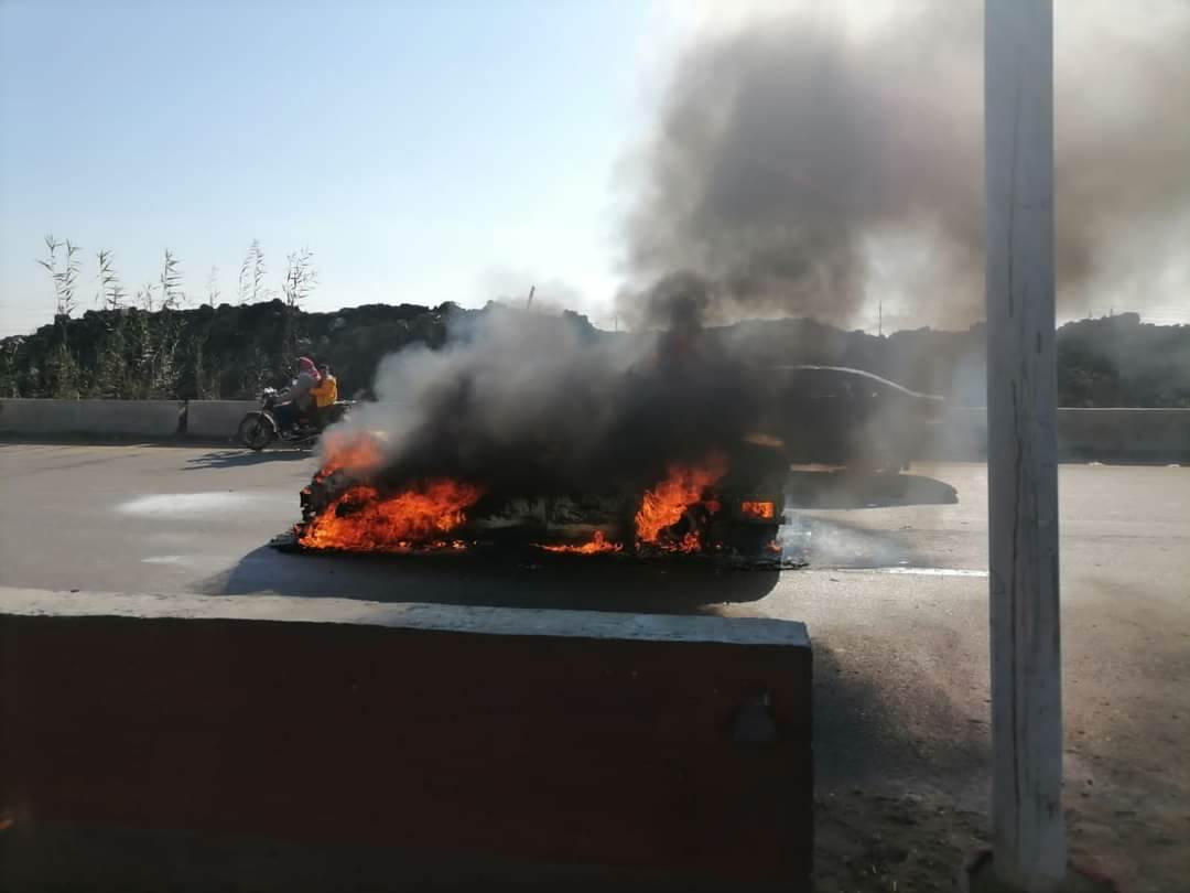بالصور.. إصابة شخص وتفحم سيارة في حادث تصادم بالدقهلية