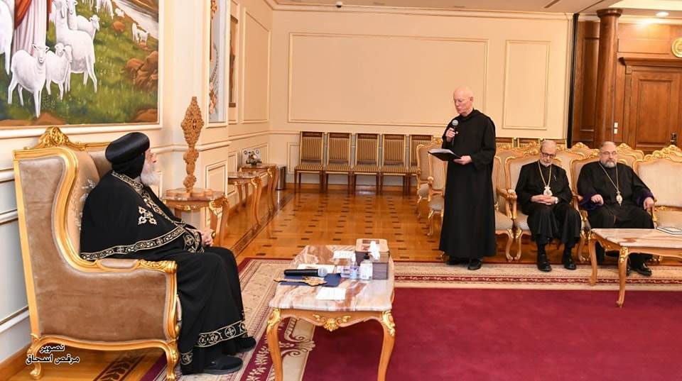 وألقى الراهب البندكتيني الأب كولومبا ستوارد المُنتدب من جانب الكنيسة الكاثوليكية كلمة شكر وتقدير لقداسة البابا، ثم ألقى قداسته كلمة ترحيب، وفي الختام تم تبادل الهدايا، والتقطوا صورة تذكارية.