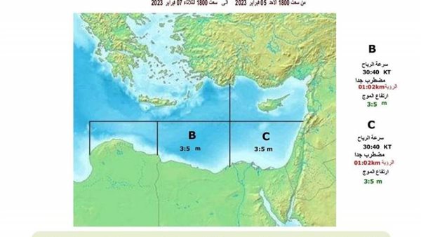 حالة الطقس .. أصدرت الهيئة العامة للأرصاد الجوية المصرية تحذيرًا بحريًا، وقالت اعتبارًا من مساء غدا الأحد ٥ فبراير ٢٠٢٣ حتى مساء الثلاثاء ٧ فبراير ٢٠٢٣، سوف تشهد اضطراب فى حركة الملاحة البحرية على مسطح البحر الأبيض المتوسط.