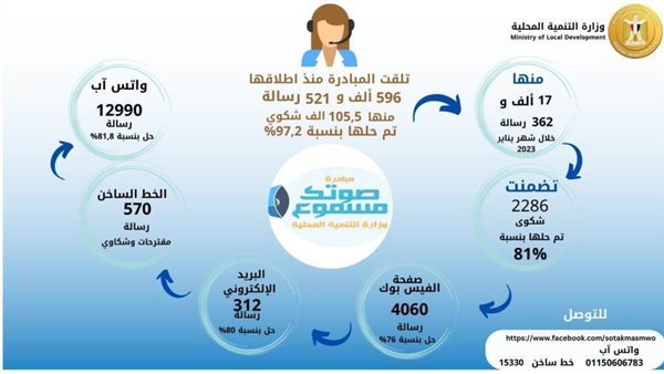 جدير بالذكر أنه يمكن للمواطنين التواصل مع فريق عمل "صوتك مسموع" عن طريق رقم "الواتس آب" (01150606783) ورقم الخط الساخن (15330) والصحفة الرسمية للمبادرة على موقع التواصل الاجتماعي "فيس بوك" (www.facebook.com/sotakmasmwo) والبريد الإلكتروني [email protected] .