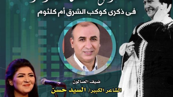 بمناسبة ذكرى رحيل سيدة الغناء العربي "أم كلثوم"، يستضيف بيت الغناء العربي "بقصر الأمير بشتاك" - بشارع المعز، التابع لقطاع صندوق التنمية الثقافية "صالون مقامات"، والذي يقام هذا الشهر تحت عنوان "أشعار في حدائق الأوتار"، بالاشتراك مع البرنامج الثقافي بالإذاعة المصرية، حيث يحيى الصالون ذكرى رحيل سيدة الغناء العربي "أم كلثوم"، وذلك فى السابعة مساء الخميس 9 فبراير الجاري.