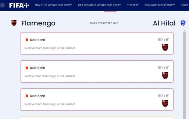 وأكد فيفا أن جرسون سانتوس دا سيلفا الذي تلقى البطاقة الحمراء خلال مباراة فريقه فلامنجو أمام الهلال السعودي، في نصف نهائي مونديال الأندية، لم يكن بمفرده، بل تحصل 3 لاعبين آخرين من فريق فلامنجو على البطاقة الحمراء عند الدقيقة 90+8، ولم يذكر فيفا سبب العقوبة أو أسماء اللاعبين، ومن المرجح أن تكون بسبب بعض المناوشات مع حكم المباراة.